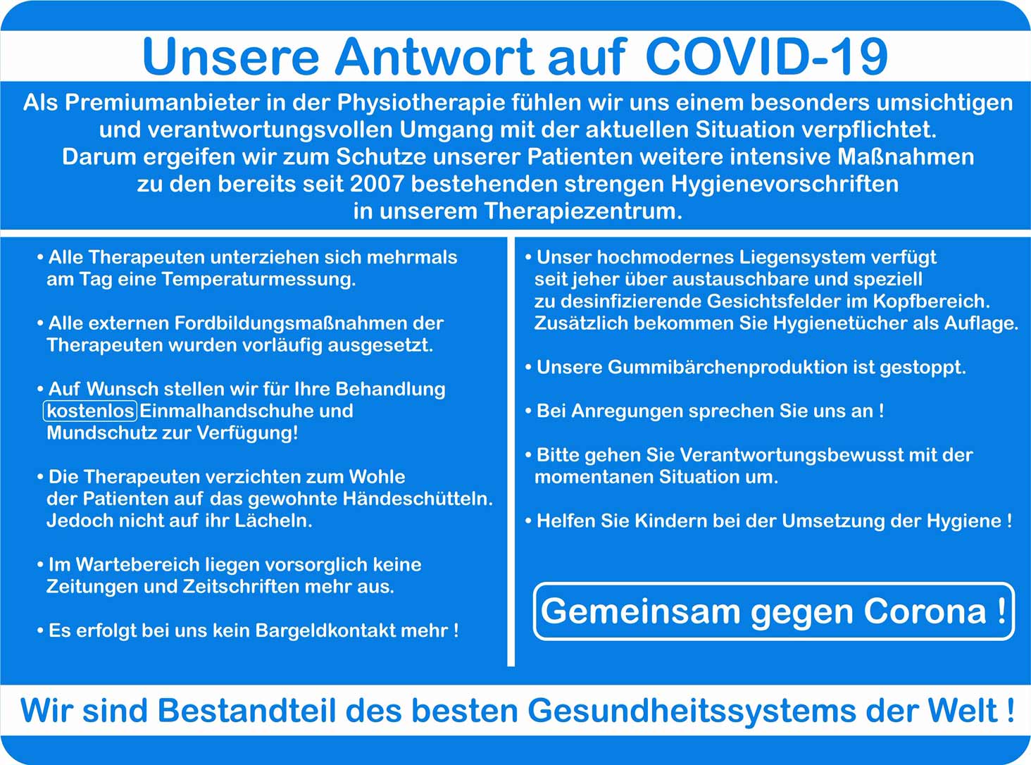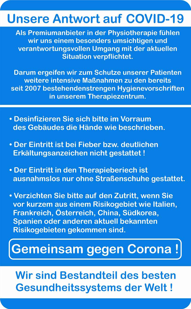Liebe Patienten, durch unseren Heilberufs- und medizinischen Grundversorgungsauftrag für das beste Gesundheitswesen der Welt bleibt die Praxis für die notwendigen ärztlich verordneten Behandlungen geöffnet.
